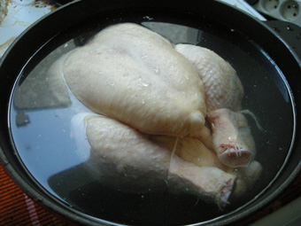 ↑ローストチキンの下準備として、前日から塩水につけてます。