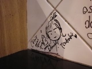 壁にはお客さんが思い思いに書いたイラストやメッセージ。